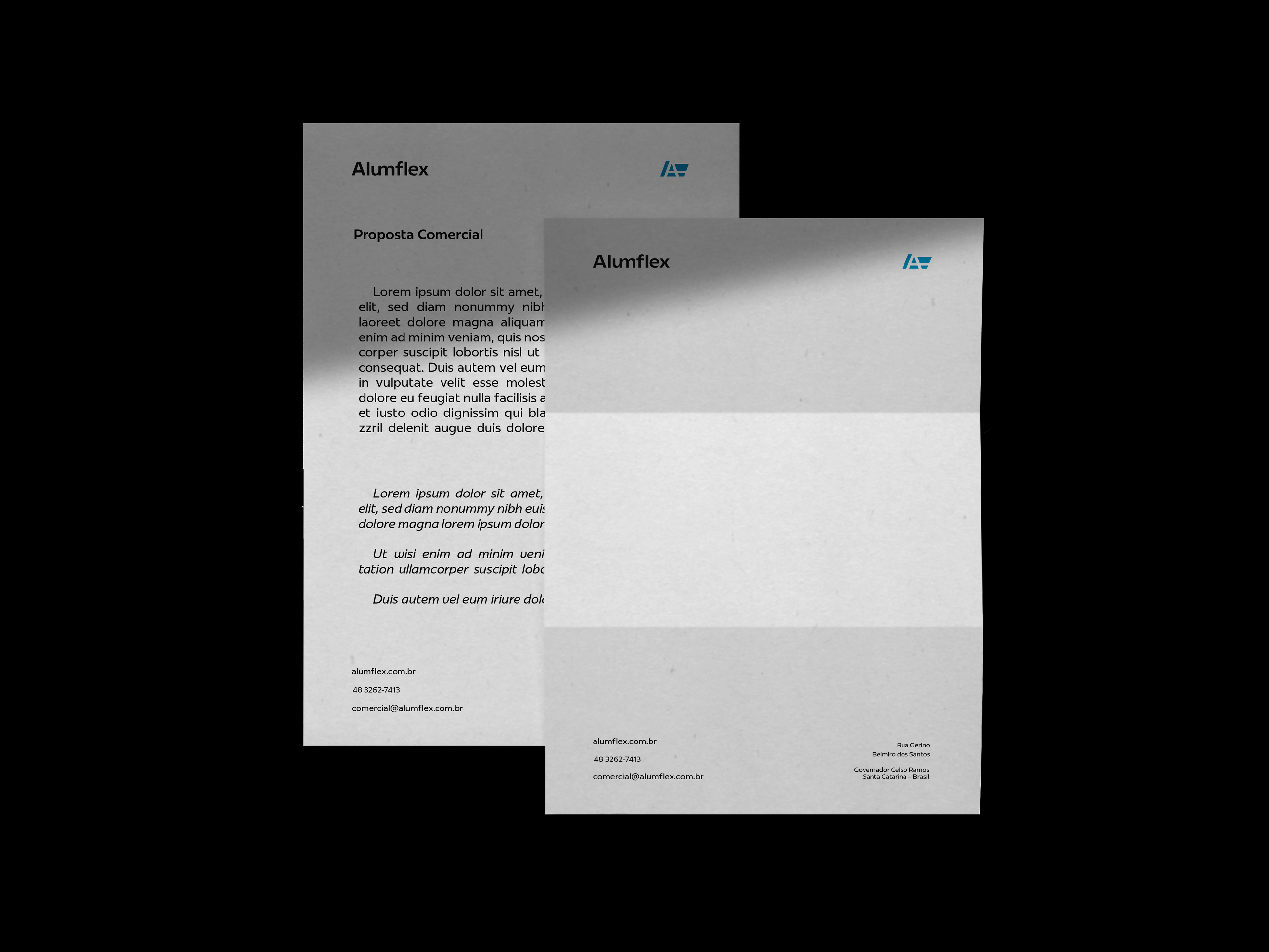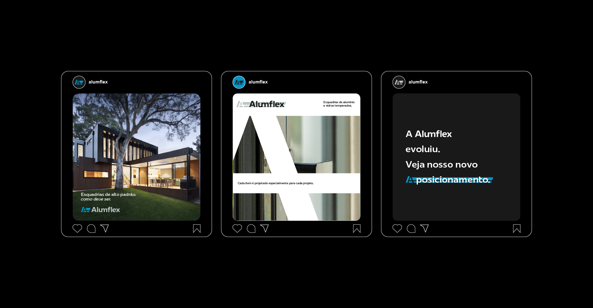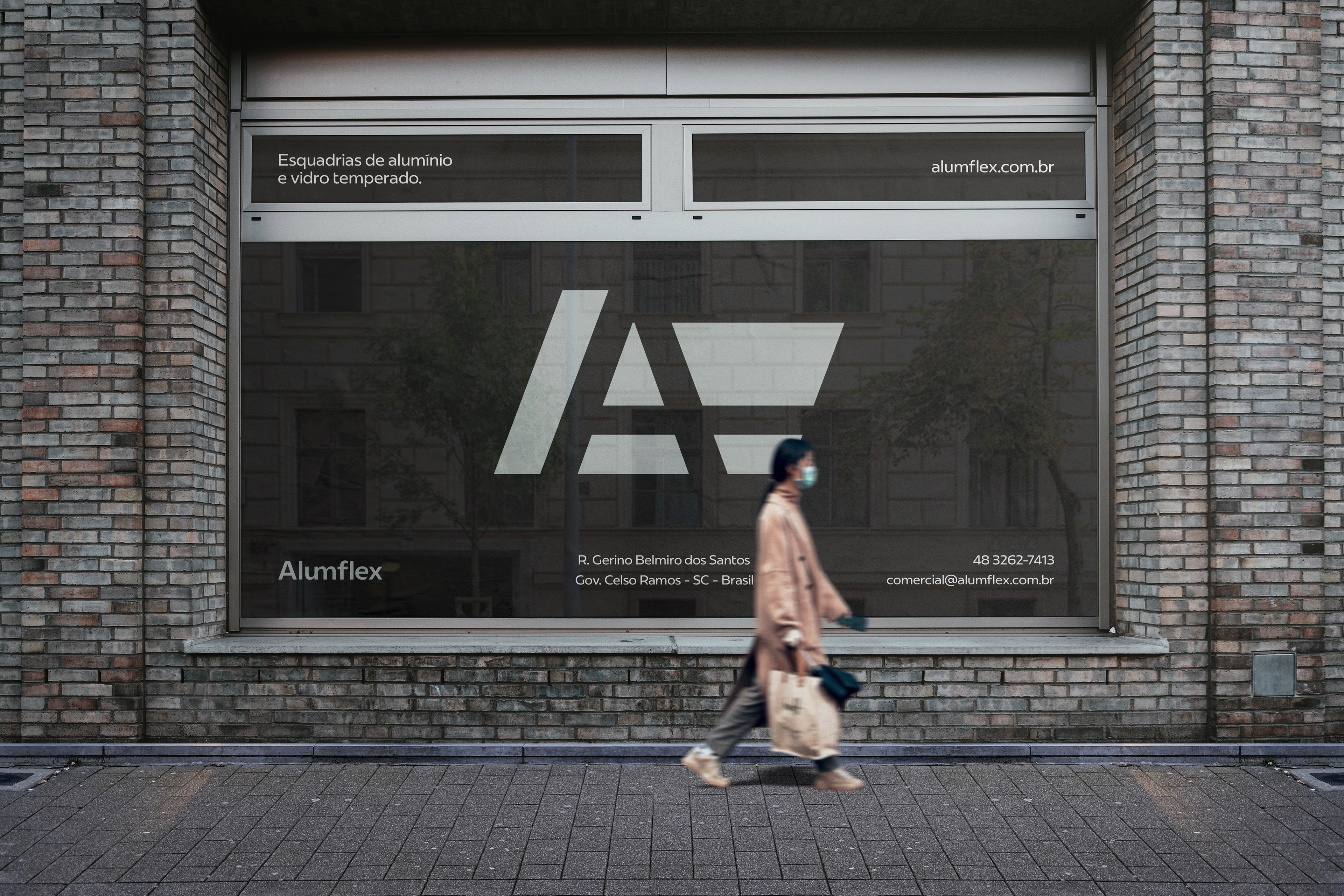 Conseguimos manter a estrutura do monograma, em seu lado negativo (gestalt), além de simbolizarmos sutilmente uma esquadria de alumínio, com suas repartições.